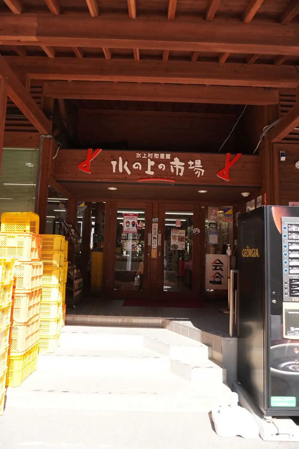 大噴水のある、水の上物産館でまずはお買い物。水上村で生産された新鮮な野菜などを豊富に取り揃えられています。ソフトクリームも人気のようです。