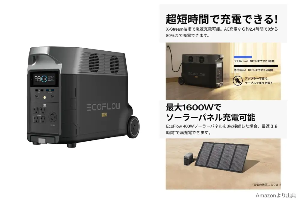 ポータブルバッテリーは、アウトドアやキャンプでの利用だけでなく、災害時に非常に役立つアイテムです。停電や通信手段が断たれた際に、スマートフォンやタブレット、ラジオなどの電子機器を充電するための電源として活躍します。これにより、家族や友人との連絡��維��したり、最新の災害情報を取得することが可能です。その中でも、キャンジョのおすすめはエコフロー社のバッテリー充電速度が早い。またソーラーパネルも併せて購入することをお勧めします。停電時はポータブルバッテリーの充電ができません。自宅の日の当たるところにパネルを設置すれば、電気が使えます。災害時に使う、ではなく日頃からポータブルバッテリーを使うことに慣れておくことをお勧めします。